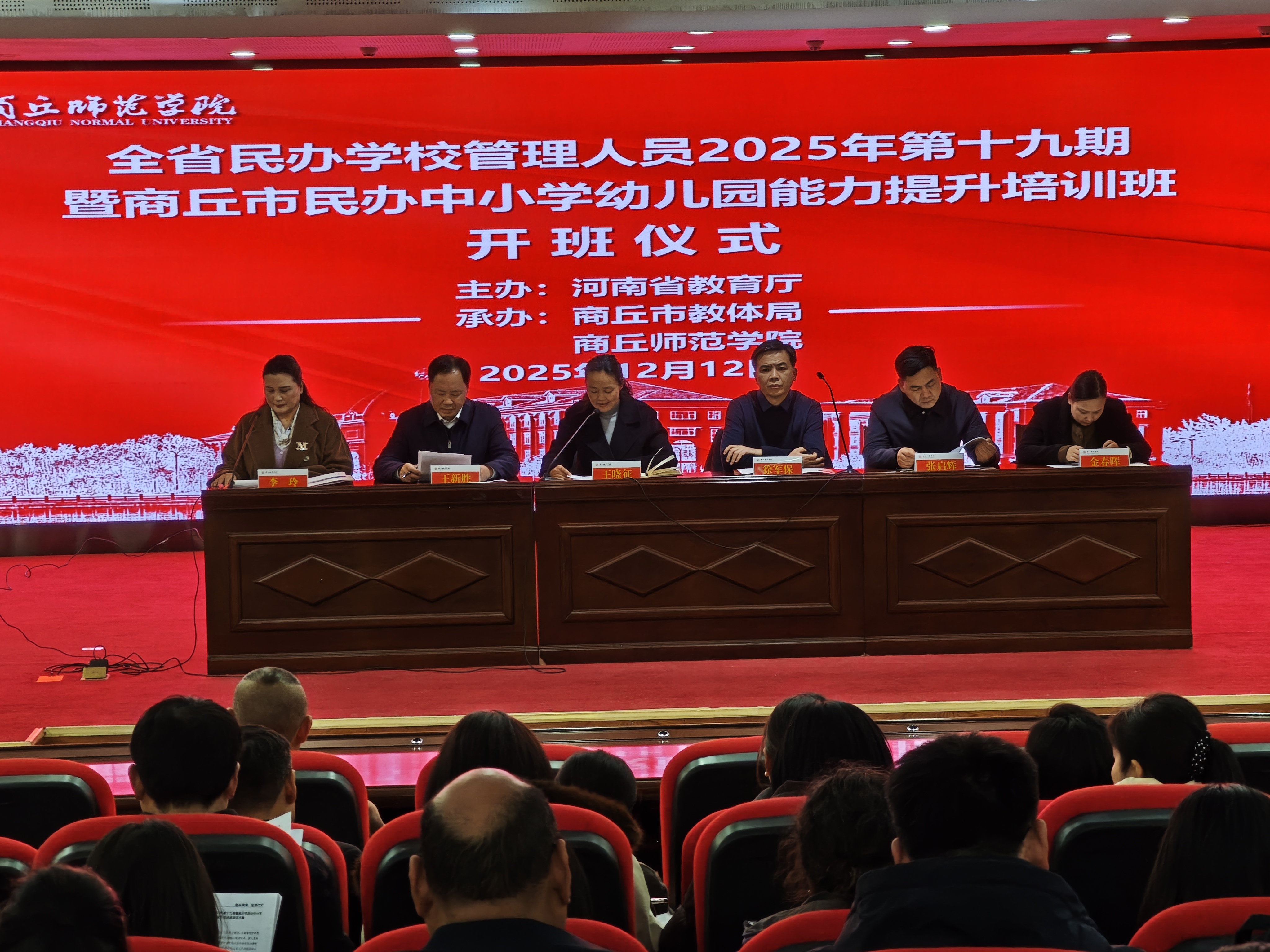 根据《河南省民办学校管理人员培训规划》和2025年度教育培训班次计划,12月12日,由省教育厅主办,商丘师范学院承办的全省民办学校管理人员第十九期暨商丘市民办中小学幼儿园校园长能力提升培训班开班仪式在我校举行。副校长王晓征、教育厅政策法规处处长徐军保、商丘市教体局局长王新胜、二级调研员张启辉、继续教育学院院长李玲出席开班仪式。