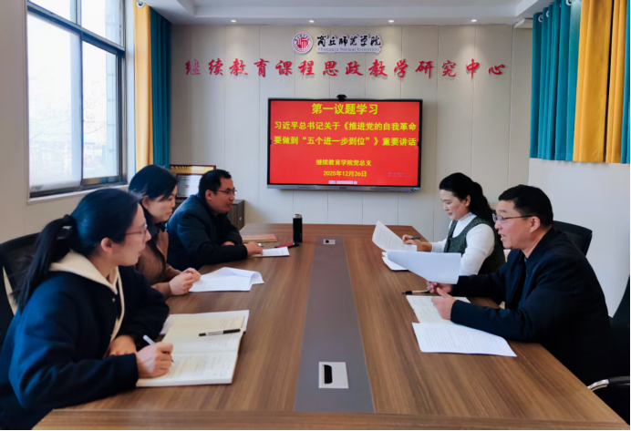 12月26日下午,继续教育学院党总支落实“第一议题”制度,组织专题学习习近平总书记重要文章《推进党的自我革命要做到“五个进一步到位”》,并提出贯彻落实举措。全体班子成员参加,牛月翰主持学习研讨。