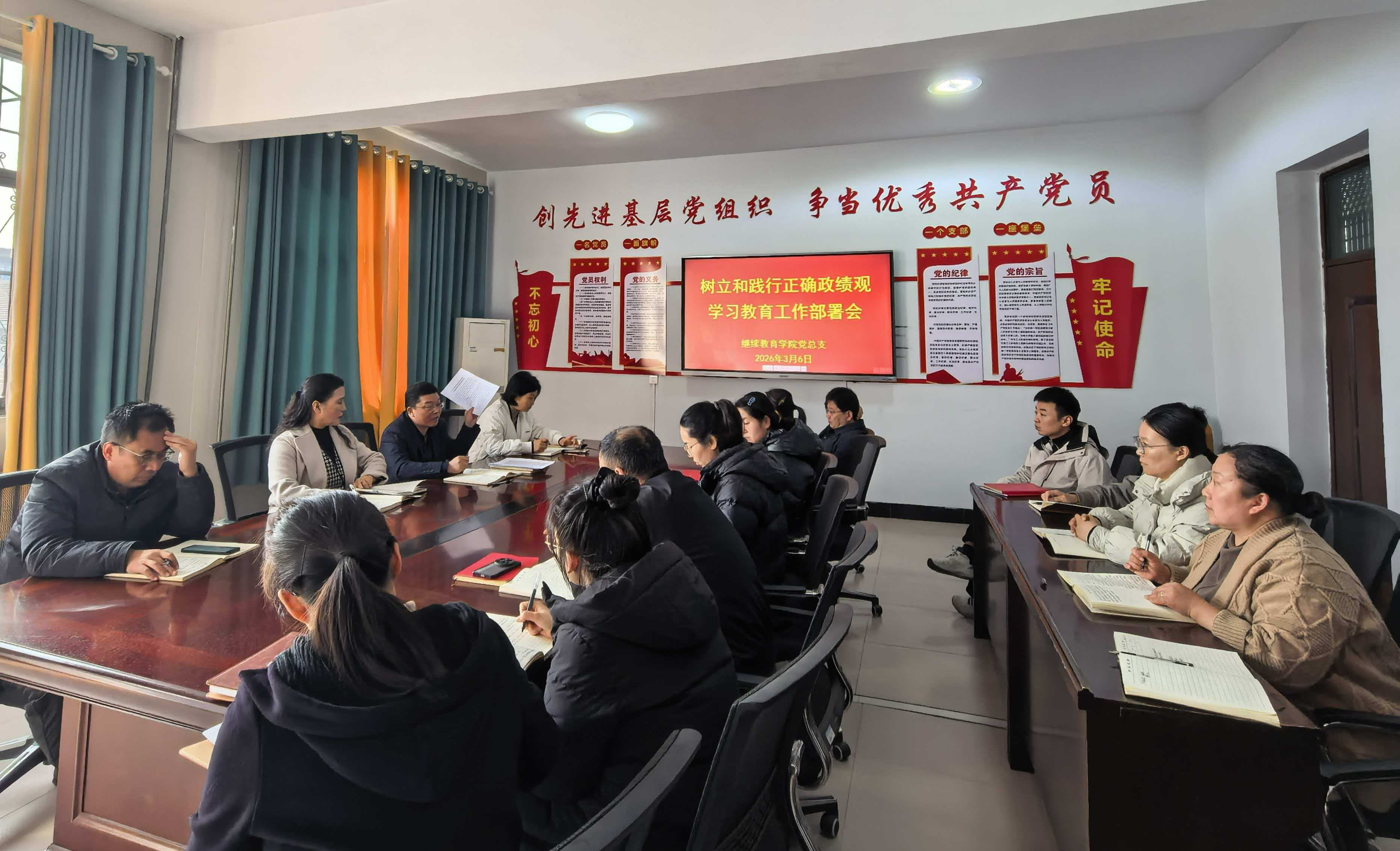 3月6日下午,继续教育学院召开树立和践行正确政绩观学习教育工作部署会,认真学习贯彻习近平总书记关于树立和践行正确政绩观的重要论述,全面落实中央党的建设工作领导小组会议精神和《中共中央办公厅关于在全党开展树立和践行正确政绩观学习教育的通知》要求,按照学校党委统一部署,启动学院学习教育工作。全体教职工参会,牛月翰主持会议。