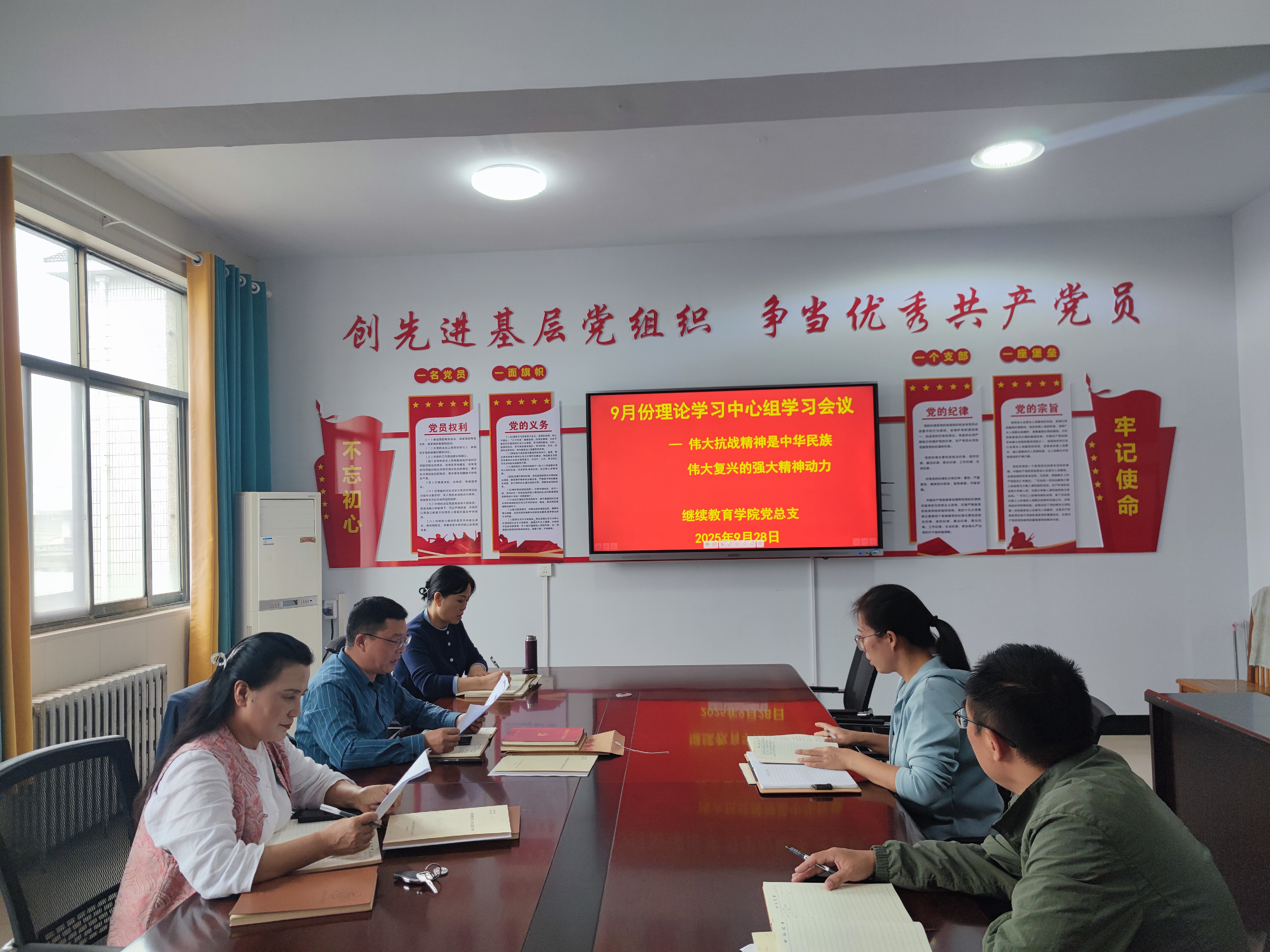 9月28日下午,继续教育学院党总支举行理论学习中心组学习,深入学习习近平总书记关于“抗战精神”的重要讲话内容。中心组成员牛月翰、李玲、张凯、司彩玲参加会议,牛月翰主持会议。