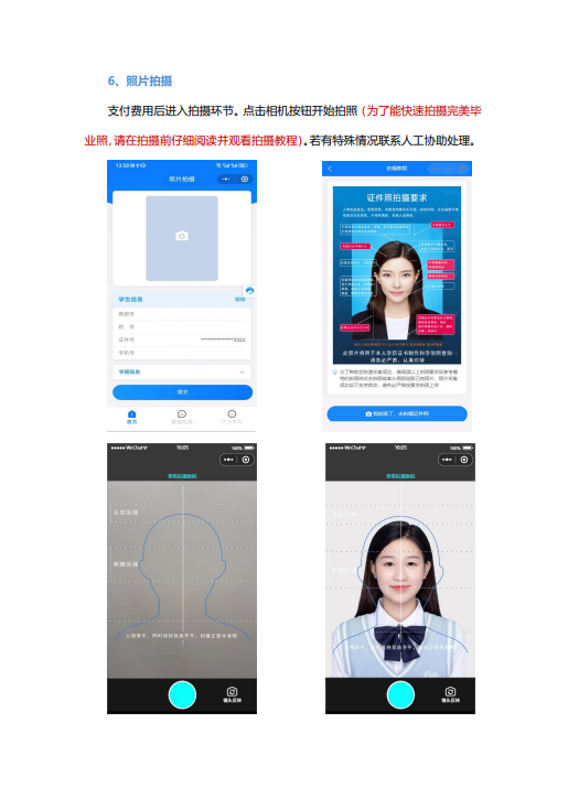 3.学生在图像采集时务必真实表达本人相貌,请勿画浓妆和美颜,尽量使用手机自带相机拍摄或到照相馆照相后在线提交,禁止对图像整体或局部进行镜像、旋转等变换操作,不得对人像特征进行修饰处理,不得添加边框、文字、装饰图案等其他内容。图像信息须正面免冠照,禁穿蓝色衣服(背景为自动生成天蓝色),具体要求见下图。