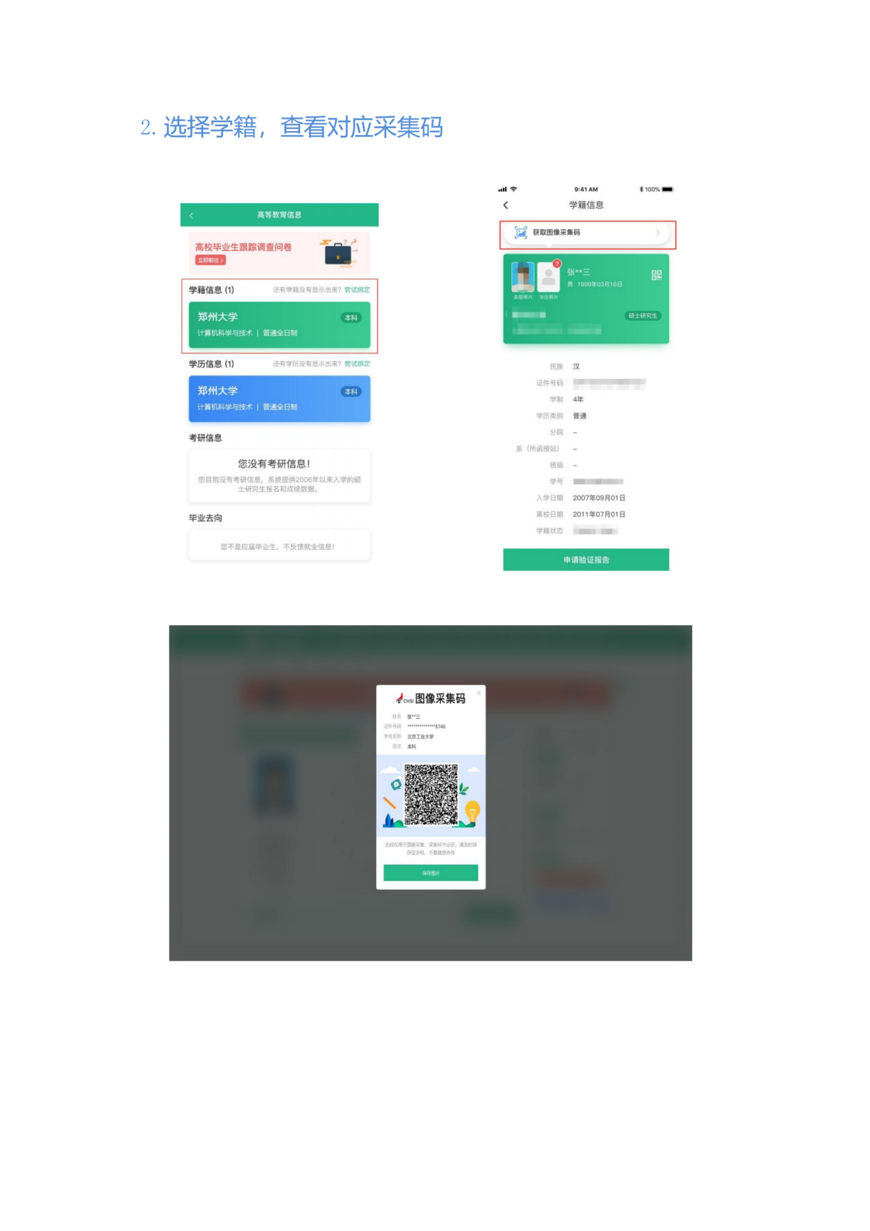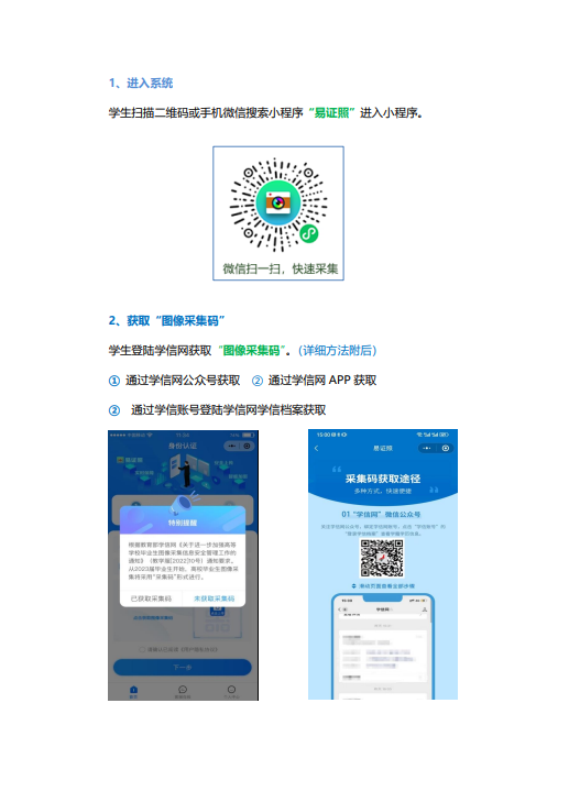1.为切实保障毕业生信息安全、保护学生隐私、优化图像采集工作流程,自2024届毕业生开始,教育部学信网开始启用“基于采集码”的图像采集新模式,学生在进行采集时需要先在学信网下载“采集码”(获取方法见附件1)后再采集图像,不再提供身份证。
